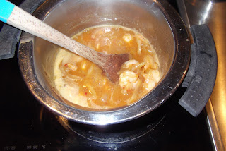 Daarna 2 kopje water erbij doen zodat een saus ontstaat. Roer goed door en kook hierna de saus voor de helft in.